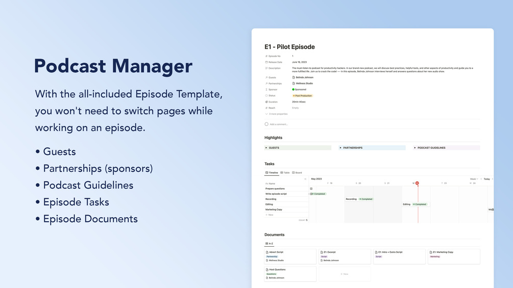 Podcast Manager comes with ready-to-use templates for master databases. The episode template is thoughtfully designed with sections dedicated to guests, partnerships, tasks, and documents, ensuring productivity and task completion without switching between pages. The guest and partner templates provide quick access to related episodes and documents.